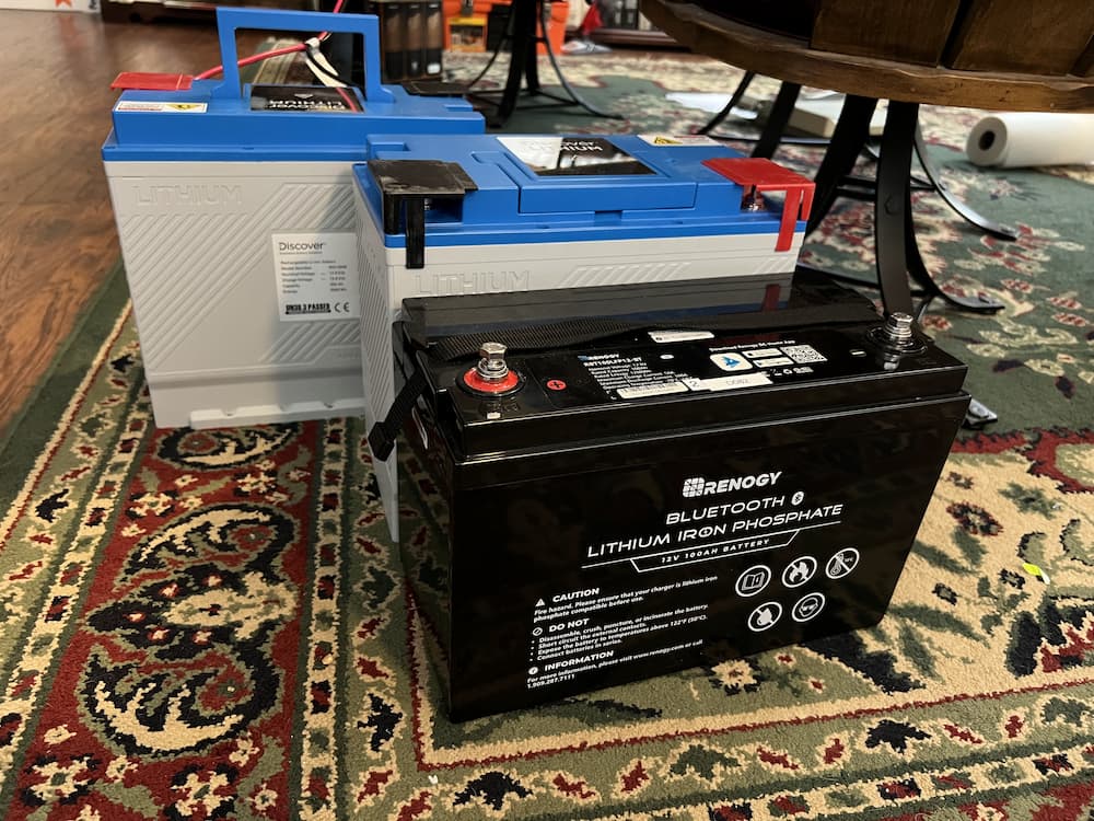 Received the two batteries today. Very nice build and the size is amazing – for perspective, one of my current Renogy 100 AH batteries in front of the 2 Discover 200 AH batteries. Discover is taller but otherwise occupying the same space although twice the capacity each. Amazing how much power is packed in these for the size!