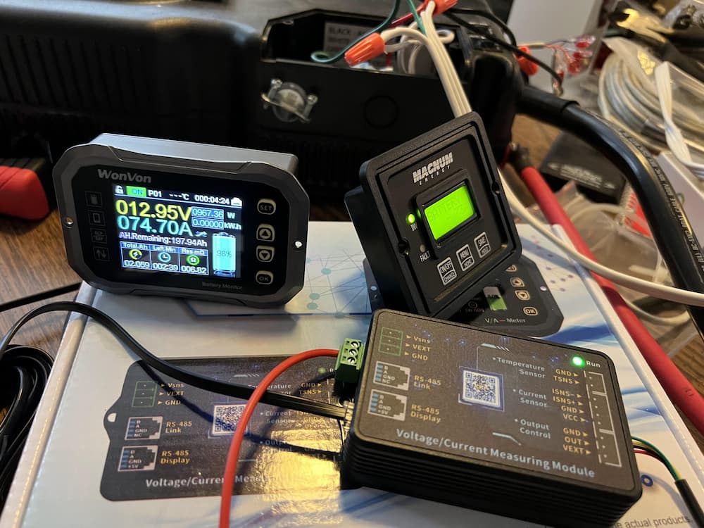 But it works! A cheap Amazon battery monitor and a 100 amp breaker completed the rats nest of wiring. Zooming in on the “WonVon” battery monitor: