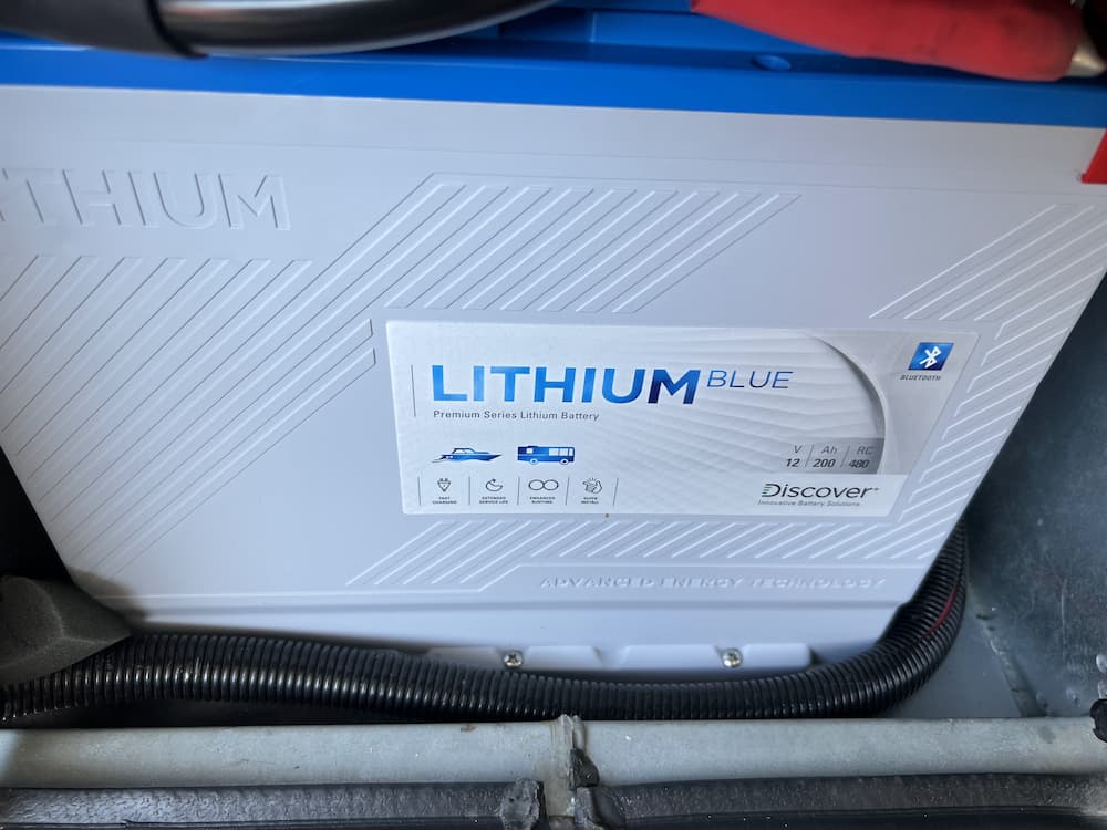 The next entrant was Discover Battery “DLB-GC12-12V Lithium Blue 12V 200Ah Battery With BMS & Bluetooth”. This is also about the size of a 100 AH battery, only taller. (Although technically two may still barely fit in the battery box, its recommended to have ventilation above, so likewise I will put them next to the inverter)