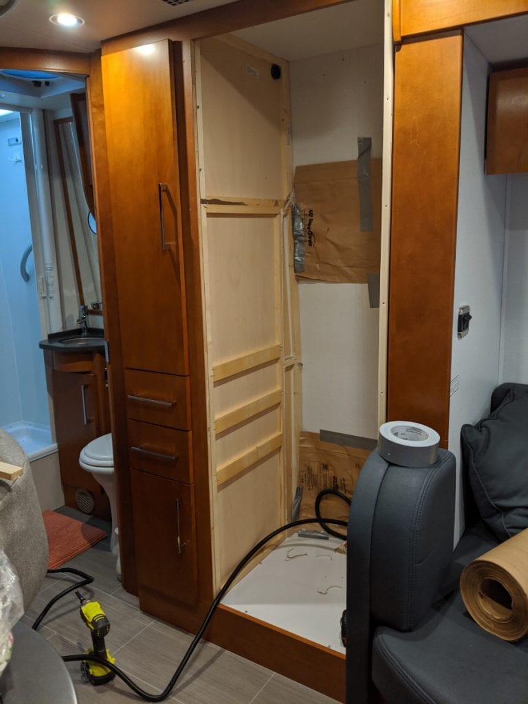 Note that I relocated the original microwave outlet to just below the shelf. The RV uses those funny miniature RV outlets with push on connectors. When I went to reinstall the wire I couldn’t find a single tool in the toolbox that would do the job.