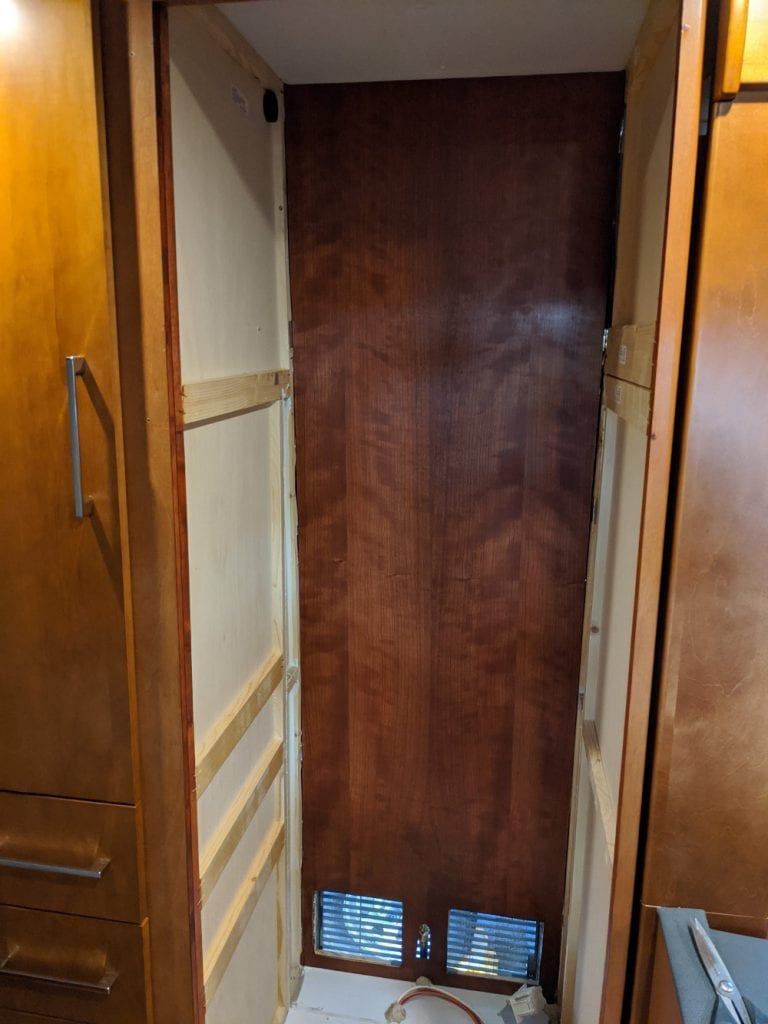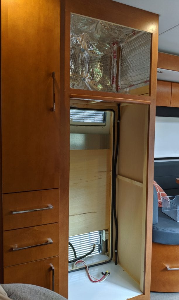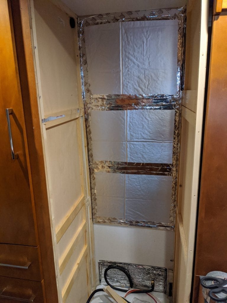 The next step is to add some more insulation on the back wall and totally seal off the vents. Since we won’t be burning propane anymore its very important that we provide the compressor with air from the RV, not from the outside.