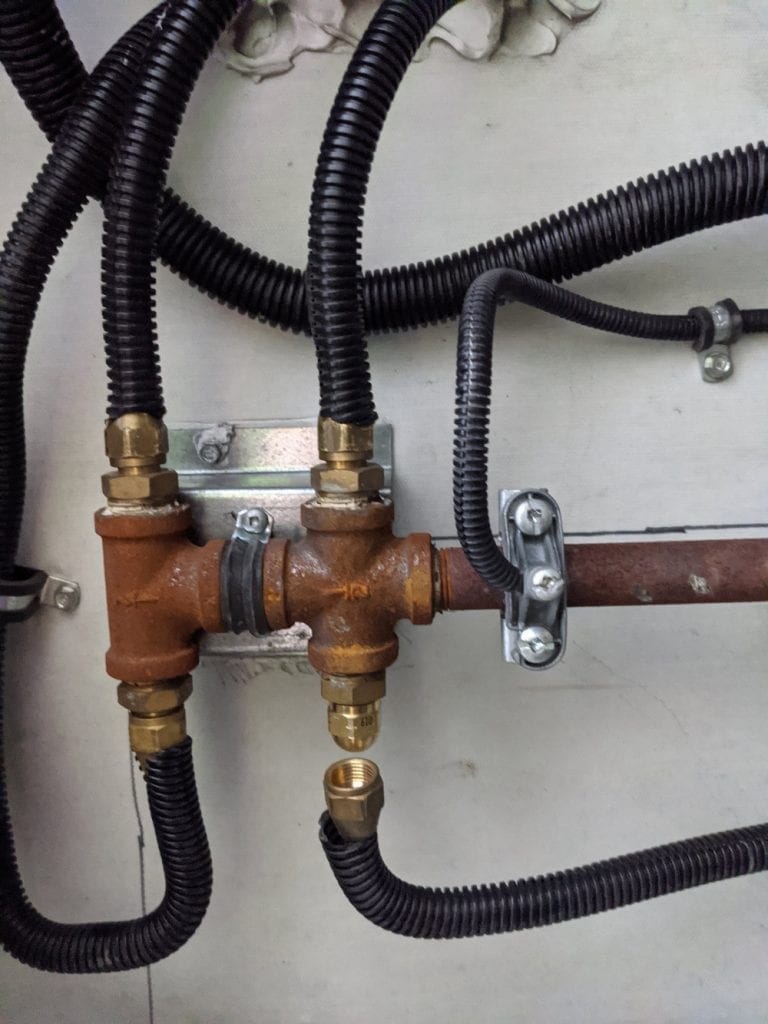 So that what I did. I climbed under the RV and found the propane manifold. There were 4 smaller diameter lines. In the image below you can see I removed the fridge line and capped it on the propane side.