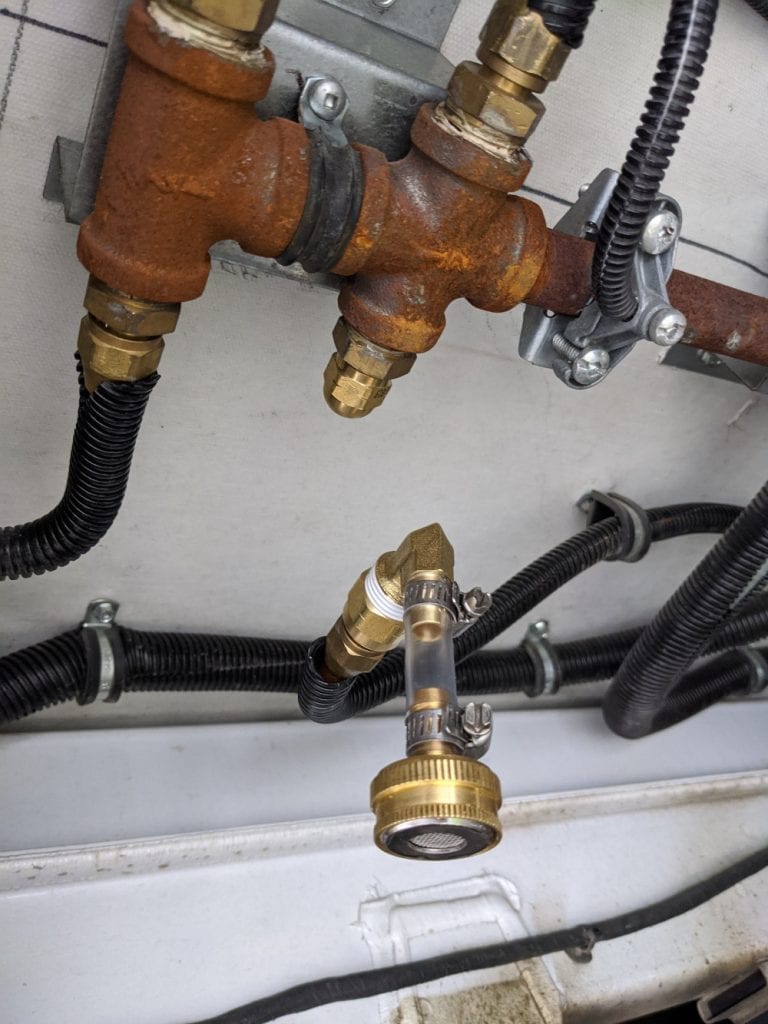 I live in Florida, and tiny critters will crawl or slither into any available orifice, so I wanted a screen on the end. I couldn’t really find a standard plumbing part that provides a screen, so I made this Frankenstein adapter out of several fittings and a garden hose screen super glued in. Fortunately nobody will crawl under my rig to laugh at me:
