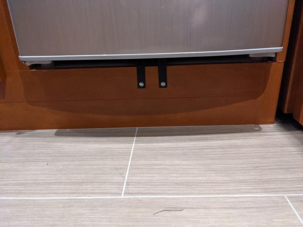 The refrigerator has a mounting bracket on the bottom, which I removed. Amazingly, a pair of 3″ corner brackets did exactly what I wanted to do: