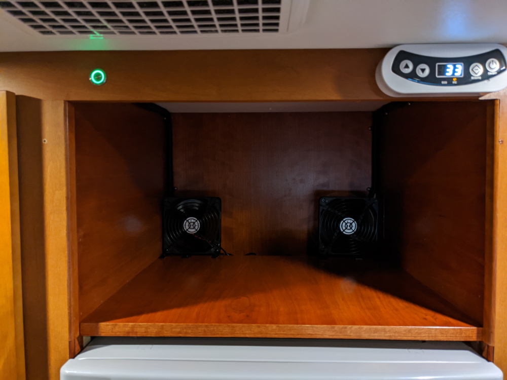 The Isotherm top mount is sort of silly and depends on a much wider cabinet, so I didn’t use it. Instead I took a pair of the same Home Depot 3″ corner braces and mounted them under the fans. They extend down and into a pair of slots on the rear of the fridge, securing that to the shelf.