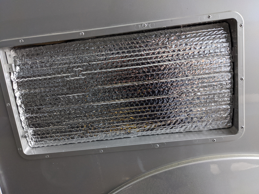 For the outside bottom doors, I make two 9″ square pieces of 3/4″ plywood to which I afixed 1/2″ marine foam insulation. Each is held in with 4 wood screws.