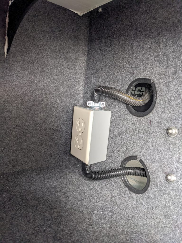The first step was to punch two holes in the compartment with an electrician’s greenlee punch set. Those holes come out surprising smooth and free of burrs but I covered the hole with a “bumper” anyway: