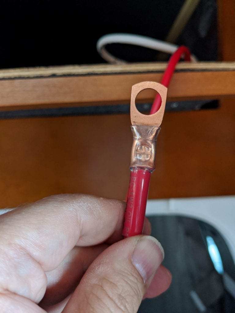 Note that I’ve used clear heat shrink double wall (with glue) tubing, the only kind you should ever buy. People use red or black to hide their ugly crimps, but you want to be able to inspect it in the coming years for corrosion, heat damage, or coming loose. Colored heat shrinks just hide that.
