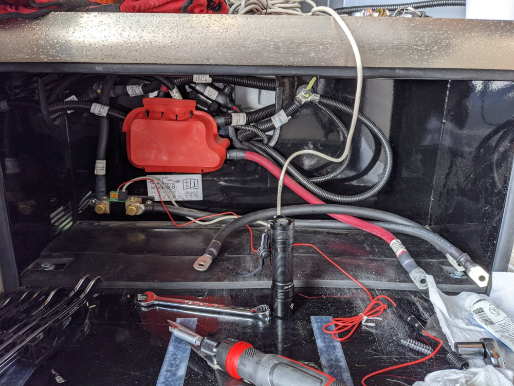 Back in the battery bay, LTV embarrassed themselves by terminating their 8 AWG solar wire into a very small (maybe 12 gauge?) pigtail fuse. So I cut that off, and the ring terminal on the negative. It was too tight in that compartment to get in with a giant crimp tool, and I don’t have any step-down butt splices laying around anyway, so I joined the 6 gauge to the 8 gauge with “Morris” connectors. (Thanks SSTraveler for the tip.)