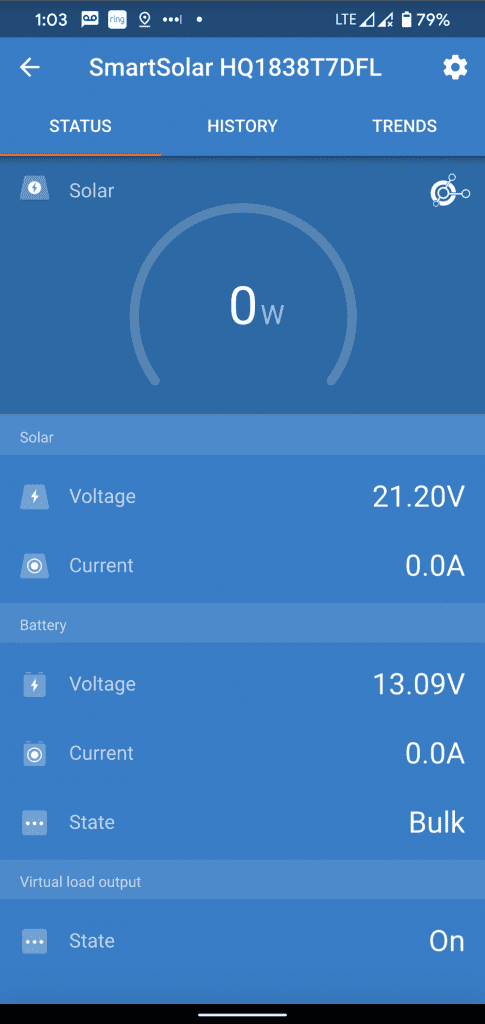 So even completely under roof, the SmartSolar was struggling to try to do its job and even went in to bulk charging mode and churned out 1 watt occasionally!
