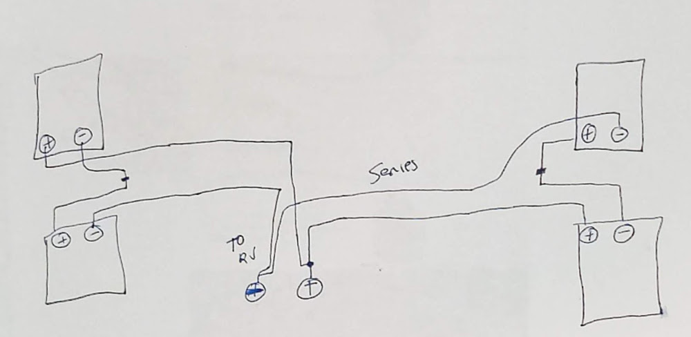 So for my van this means the only thing I need to do is unplug the positive of one of the cells on each side of the RV, and the negative of the other, and connect them together! Then, as you can see, each pair is wired in series and lastly paralleled.