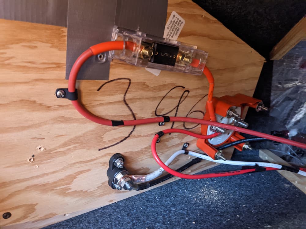 A couple of notes here. I used 6 gauge for everything – bigger is always better. I also covered with wire looms as LTV does. This is really completely unnecessary in a sealed compartment, but it will help prevent rodents from chewing on your prize.